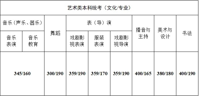 艺术类校考本科专业录取控制分数线:历史等科目类文化478分/专业校考合格,物理等科目类文化462分/专业校考合格。专业校考合格的考生还须参加相应专业省统考,且省统考成绩须达到音乐类135分、舞蹈类180分、表(导)演类(