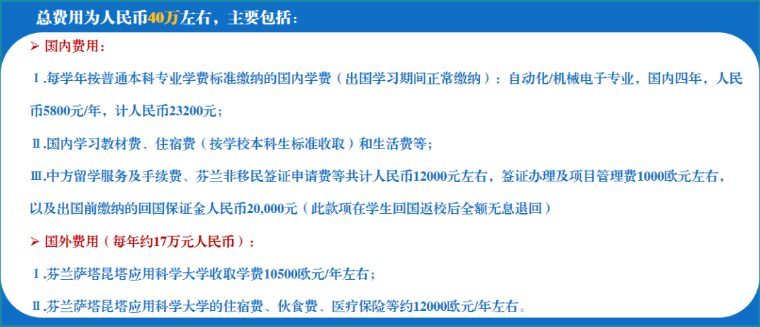 2.本项目学生如在第一、二学年内未达到芬方大学要求,可在国内延长学习时间,直至达到芬方大学要求后派出(如雅思成绩达不到6.0但达到5.5的学生也可赴芬入学,但须先参加芬方高校的