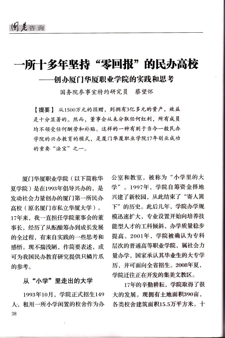 国务院参事室主办的国务院内刊《国是咨询》曾刊文肯定学校理事会的“零回报”办学模式是华厦学院创业成功的重要“法宝”之一。