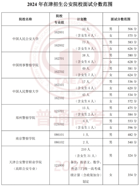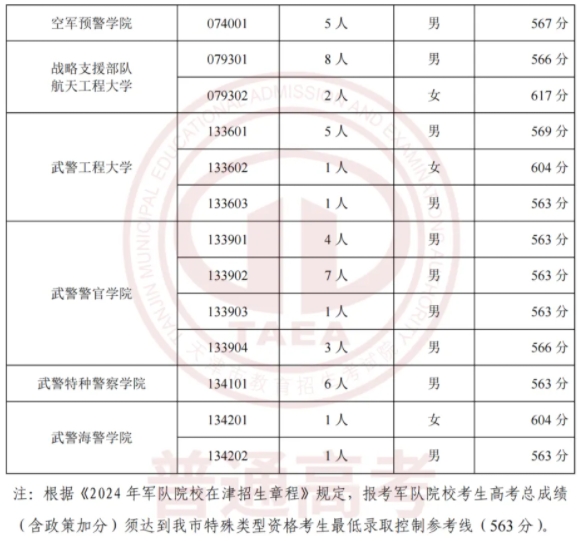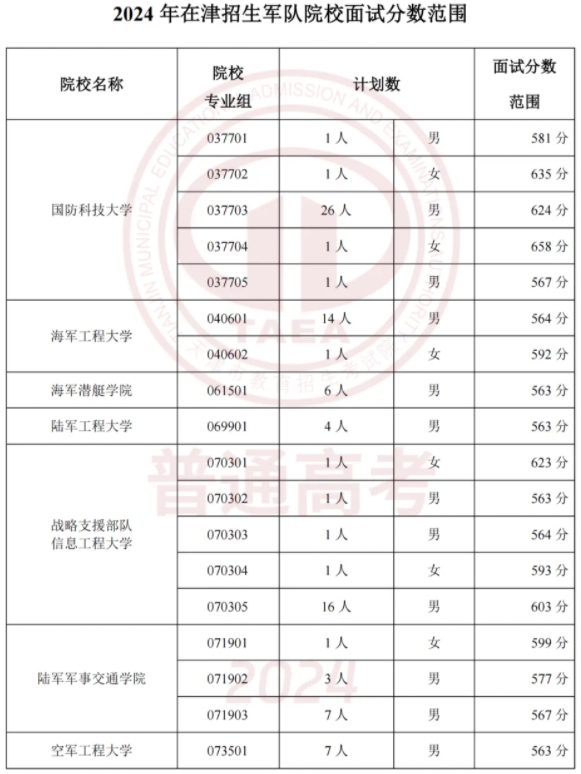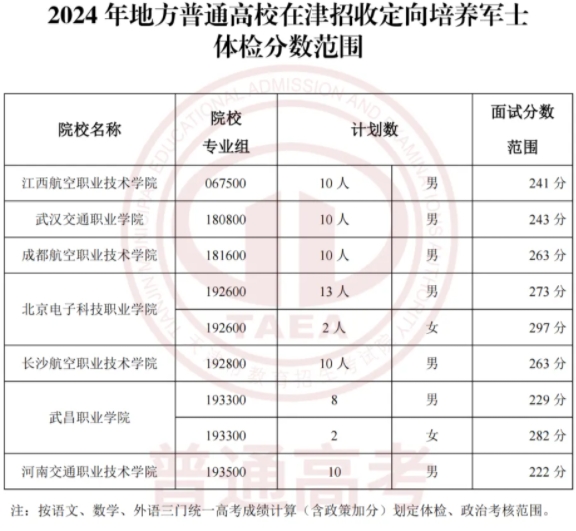 军事院校、公安院校的招生负责部门根据国家有关规定,依据提前本科批次A阶段考生院校(专业组)志愿的报考情况和院校在津招生计划数,按照一定比例确定了参加面试、体检、体能测评的分数范围。凡提前本科批次A阶段院校(专业组)志愿报考军事院校、公安院校且达到相关院校(专业组)分数要求的考生,须按规定时间和要求参加有关单位组织的面试、体检和体能测评,逾期不再补测。