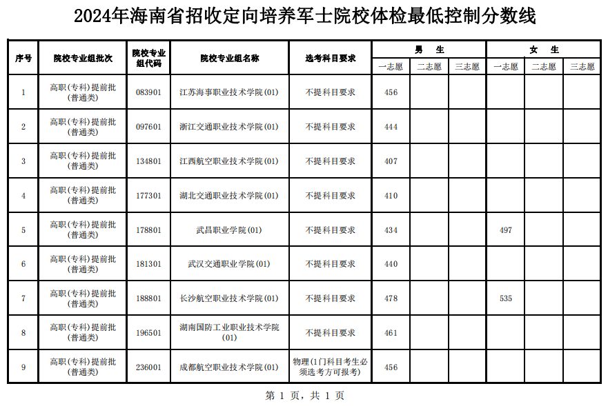 2024年海南省招收定向培养军士院校体检最低控制分数线
