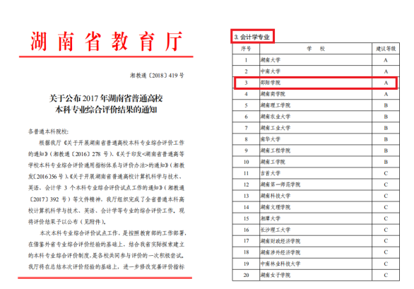 会计学专业在湖南省本科专业综合评价获评A类专业