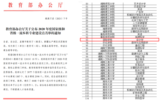专业特色:会计学专业于2006年经国家教育部批准设立,是湖南省地方二本院校较早布点的专业。本专业秉承“以德为先、基础为本、能力为重、应用为实”的办学理念,实行“岗位需求为依据、产学对接为标准、职业发展为内核”的体现应用型本科高校办学特色的人才培养新模式,为地方经济社会发展培养了大批优秀财务会计工作者。本专业师资力量雄厚、办学条件优良、教学科研成果显著,设有湖南省工商管理类人才创新创业教育基地、湘西南乡村振兴研究基地、邵阳学院工商管理应用特色学科、湖南省精品在线开放课程等专业学科发展平台;是邵阳学院“十三五”综合改革试点专业、邵阳学院“双一流”建设专业、湖南省本科专业综合评价A类专业,湖南省首批“一流专业”建设点、国家级“一流专业”建设点。