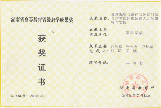 专业特色:法学专业紧密结合地方发展的现实需求,突出应用性人才的培养。构建了“通识教育、专业教育、实践教育、素质拓展”的一体化课程体系;教学内容“职业技能化”,仿真实验室、庭审观摩、模拟法庭、专业实习、法律思维与论辩、法律文书写作、律师制度与实务、法律职业伦理等课程,能够满足应用型法律人才职业技能的培养要求;师资队伍“双师双能化”,法学专业有70%的双师双能型教师;校地合作,协同育人基地化,法学专业目前拥有教育部大学生校外实践教育基地、湖南省教育科学应用法学人才培养研究基地、湖南省法治人才培养院校合作创新创业基地,与邵阳市内的法院、检察院、律师事务所28家单位签订有实习协议,形成了突出产出导向的“六共同”校地协同育人培养模式。现为湖南省“十二五”省级综合改革试点专业、湖南省一流本科专业建设点,2019年在全省本科专业综合水平评价中获优秀A类(全省第四名)。