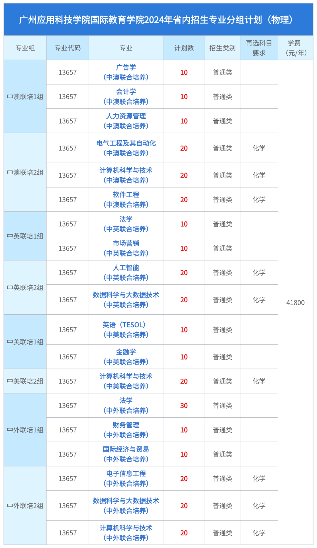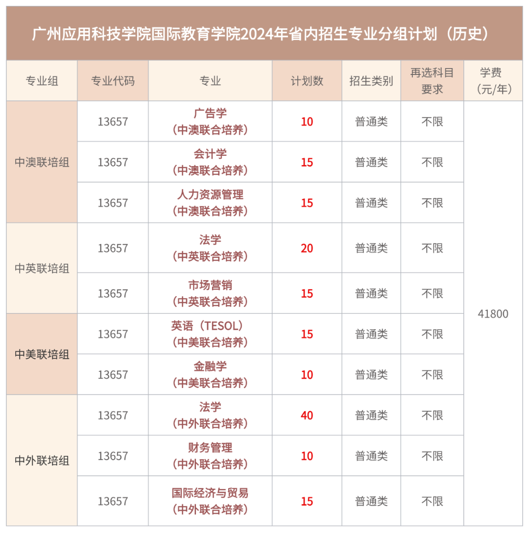 广州应用科技学院国际教育学院2024年省内历史组计划招生人数为165人,共开设10个专业供学生报考。中澳联培组和中外联培组分别开设了3个专业,中英联培组和中美联培组分别开设了2个专业,所有专业对学生再选科目要求不限。