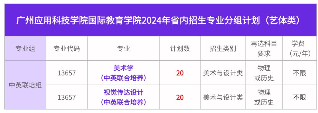 广州应用科技学院国际教育学院2024年省内体育艺术组计划招生人数40人,共开设2个专业供学生报考。分别是美术学、视觉传达设计,都是由中英联合培养组开设,对学生首选科目要求是物理或历史,再选科目要求不限。
