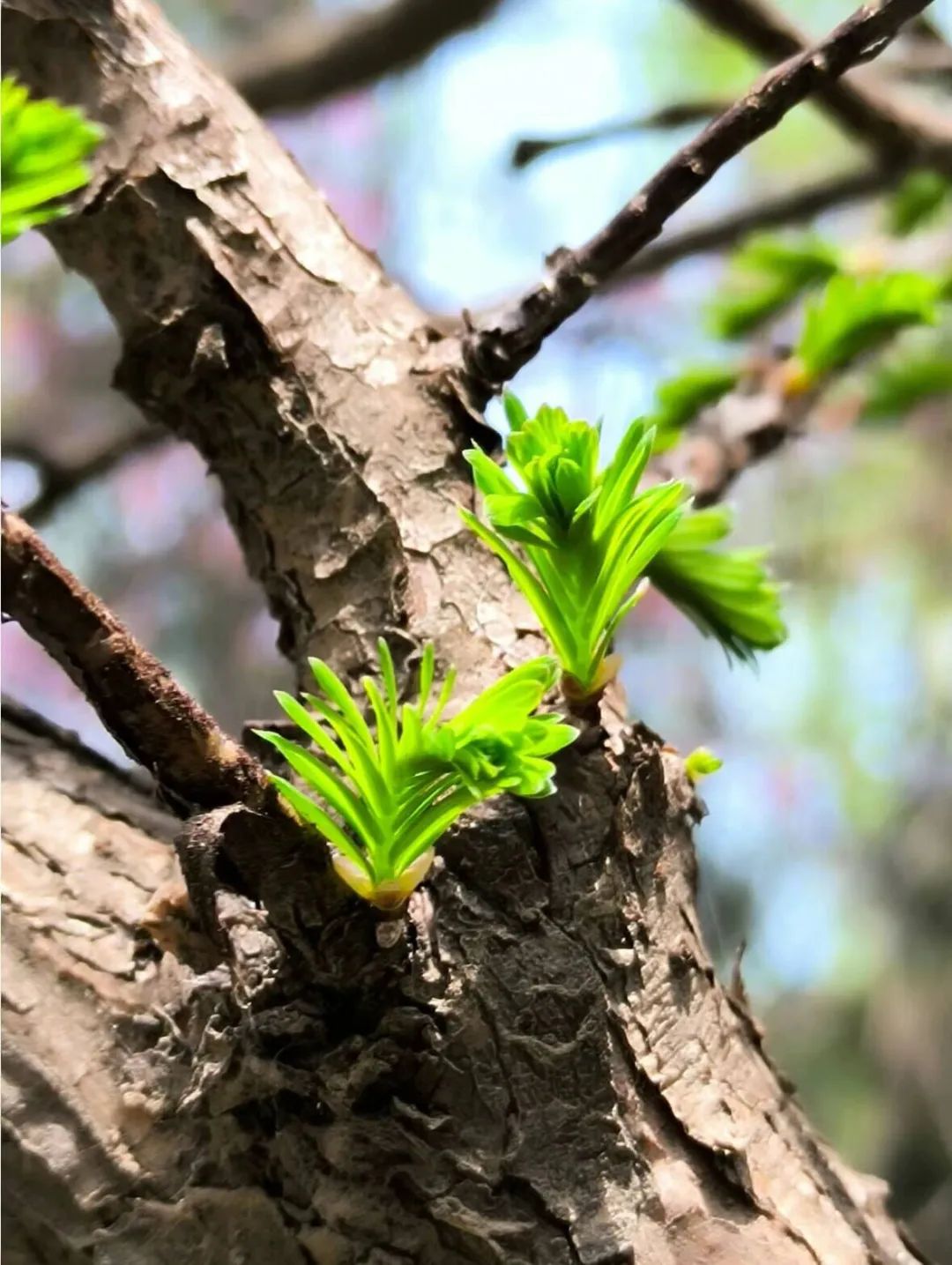 生机盎然之春在玉兰树细芽初生的嫩绿里