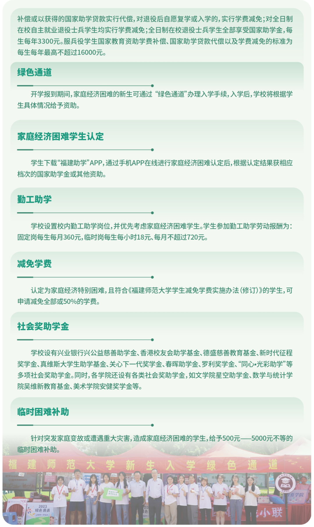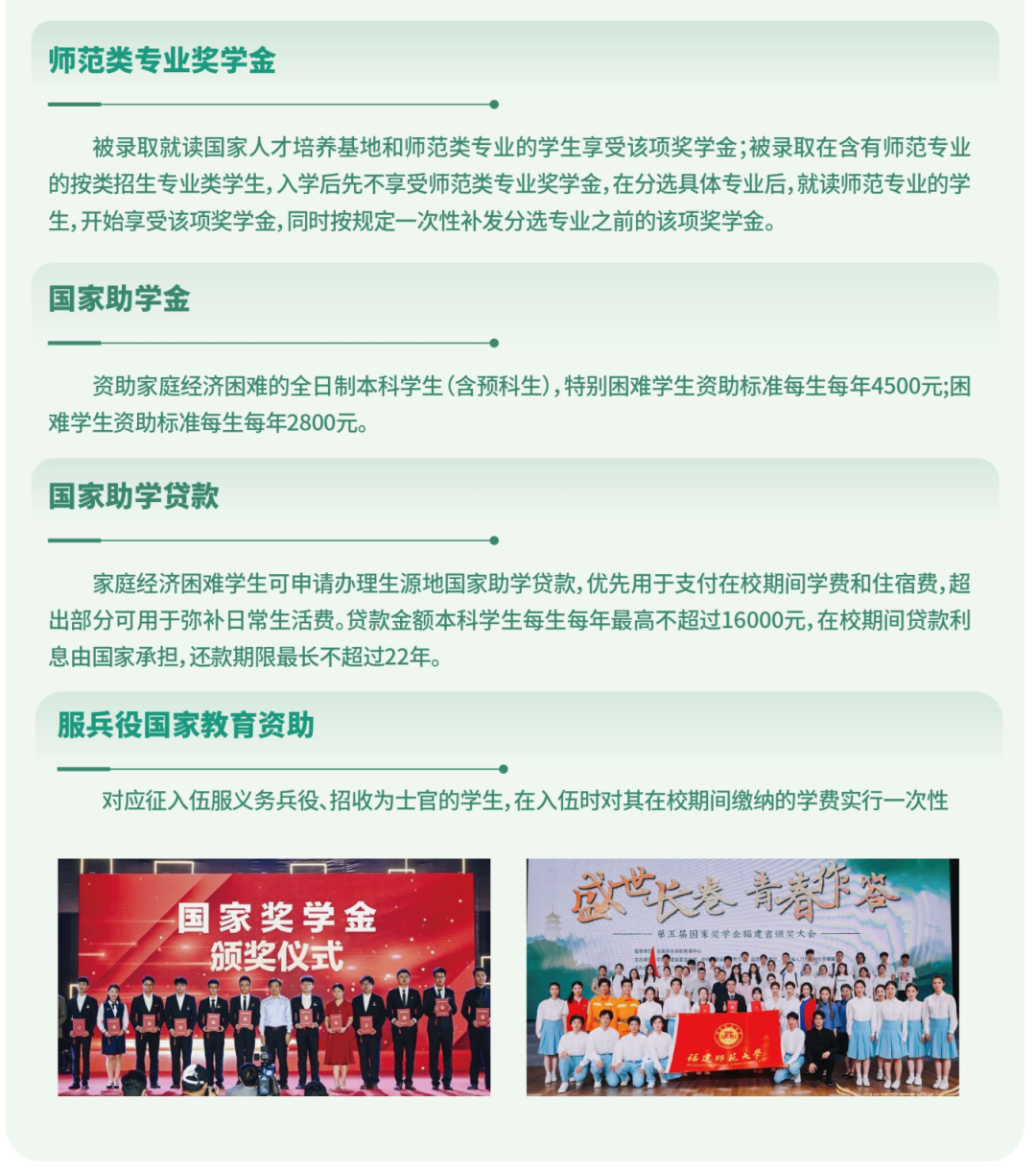 学校重视校园环境建设,以校园增绿补绿、美化和景观精品建设为主线,按照“河与湖相连,湖在景观中,水绕景观流”的立体化校园生态绿化景观建设思路,打造绿色、生态、文明的“山水学村”,形成“春有花、夏有荫、秋有果、冬有绿”的校园生态格局。11◆奖助护航 筑梦未来◆奖学筑梦,助航未来。学校建立奖、助、贷、免、勤、补等“九位一体”奖助体系,形成“入学--在学--毕业--就业”全链条式闭环资助模式,有力确保学生上学无忧、在学无忧、发展无忧。感恩回馈,从福建师范大学开始。