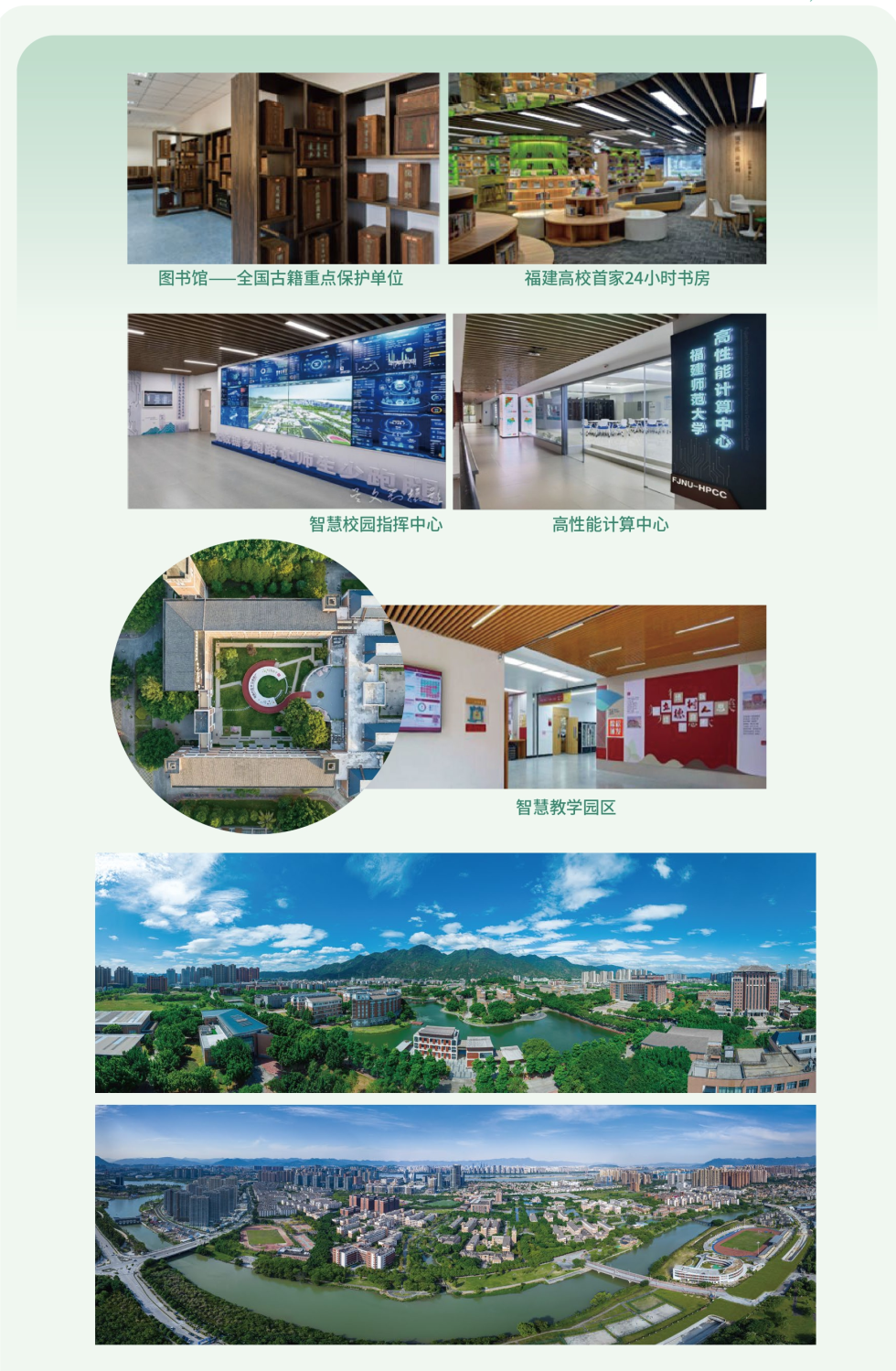 10◆条件优良 环境优美◆景致如画,生态学府。学校办学条件优良,有旗山、仓山两个校区,占地面积4000多亩。现有纸质图书近500万册、电子图书560多万册,图书馆为全国古籍重点保护单位,尤以丰富的古籍、善本、碑刻、字画、地方文献、早期外文原版书籍和“五四”前后代表性报刊的收藏享誉海内外。校园网络设备完善、应用广泛,实现无线网络校园全覆盖。拥有一批高水平体育场馆,运动设施完备,较好满足各类赛事、训练、健身运动的需求。人和景明,从福建师范大学开始。
