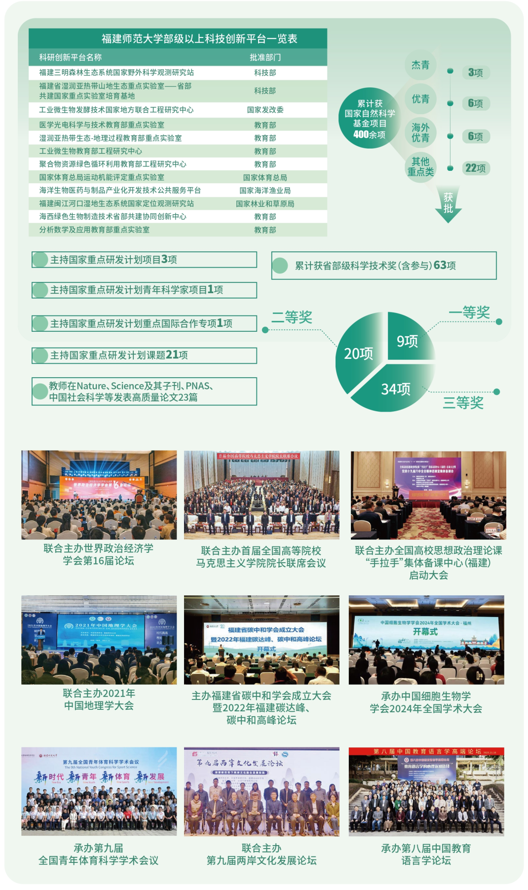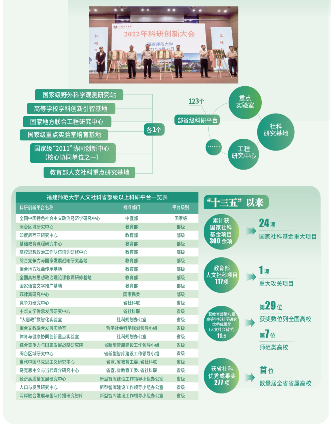 06◆科研创新 勇攀高峰◆革故鼎新,锐意进取。学校始终坚持“四个面向”,服务“国之大者”,大力推进协同创新,主动融入国家战略和地方经济社会发展,强化有组织的科研。人文社科研究优势突出,自然科学研究水平显著提升。创新创造,从福建师范大学开始。·