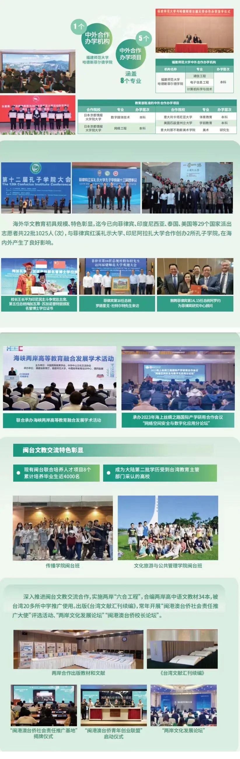 09◆开放办学 交流活跃◆海纳百川,汇通天下。学校坚持开放办学战略,着力高水平引进来、大步伐走出去,深化务实合作,注重提质增效,打造全方位、宽领域、多层次的对外开放办学格局。与美国、英国、意大利、澳大利亚日本等国家和地区的130多所高校、科研机构及联合国教科文组织建立友好合作关系,与台湾40多所高校建立实质性合作关系。兼收并蓄,从福建师范大学开始。