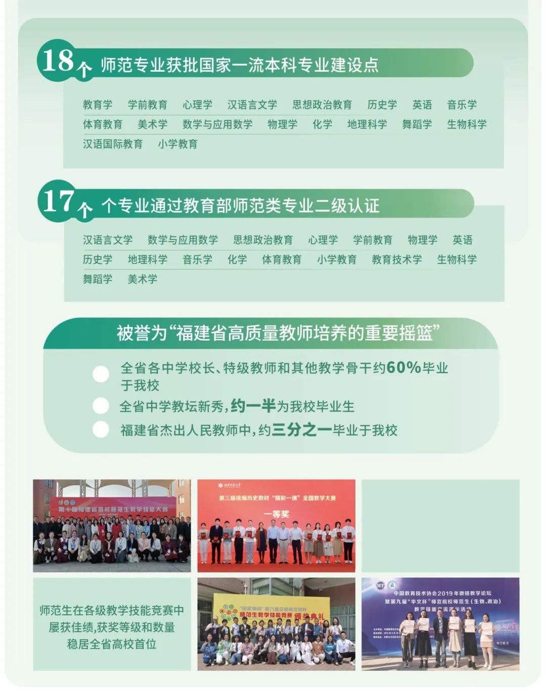03◆师范教育 特色鲜明◆尊师重道,铸就卓越。学校大力发扬百年师范优良传统,主动投身新时代教师教育振兴大潮,不断擦亮教师教育“金字招牌”。18个师范专业获批国家一流本科专业建设点,17个专业通过教育部师范类专业二级认证,入选卓越教师培养计划实施院校、教育部复合型高中教师培养试点高校。躬耕教坛,从福建师范大学开始。
