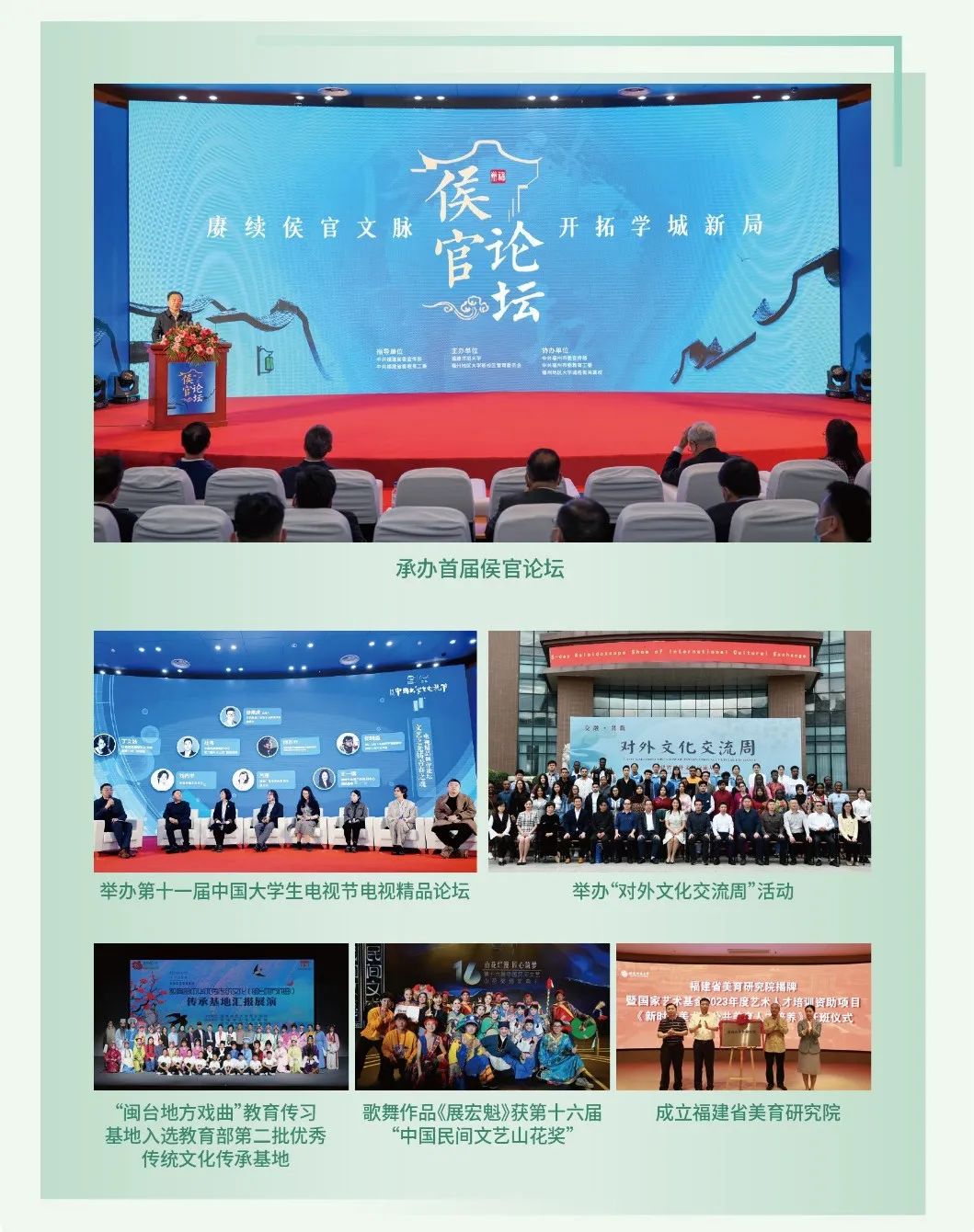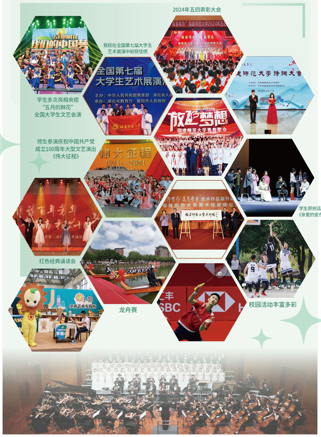 学校注重以美育人、以文化人,弘扬主旋律、突出高品位,坚持用明德引领风尚,用美育浸润心灵。每年开展“高雅艺术进校园”“艺术实践专场演出”“艺术作品展”等系列活动百余场,让学生近距离、全方位感受高雅艺术,学校在全国大学生艺术展演活动中屡创佳绩。“福师大小葵”网络思政工作品牌树全国标杆,推出网络文创产品2000余种,围绕“三节三月三季”的校园文化主题,形成“迎新晚会”“国庆游园”“社团文化节”“十佳歌手赛”“校园舞蹈大赛”等覆盖全学年、活动形式多、参与范围广的校园文化系列活动,青年学生在文化的舞台上施展才华,飞扬青春。大展身手,从福建师范大学开始。·