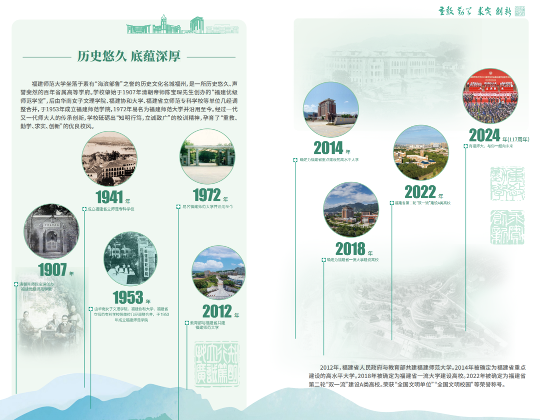 她是培育英才的殿堂无数灵感在这里碰撞迸发她是智慧之海的灯塔指引我们找到前行的方向她是花样年华的具象化你想你敢你注定无憾少年的梦想坚定而炙热你的、我的、他的从这里开始从福建师范大学开始我们怀揣梦想,一同起航01◆历史悠久 底蕴深厚◆百年春秋,薪火相传。学校肇始于1907年清朝帝师陈宝琛先生创办的“福建优级师范学堂”,后由华南女子文理学院、福建协和大学、福建省立师范专科学校等单位几经调整合并,于1953年成立福建师范学院,1972年易名为福建师范大学并沿用至今。经过一代又一代师大人的传承创新,学校砥砺出“知明行笃,立诚致广”的校训精神,孕育了“重教、勤学、求实、创新”的优良校风。继往开来,从福建师范大学开始。