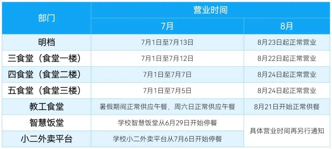 全体师生:根据学校2024年暑假放假前后相关工作安排,结合饮食服务中心实际情况,现将饮食服务中心2024年暑假放假前后食堂开餐安排如下: