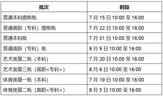 征集志愿必须由考生本人到当地招生考试机构指定的具备视频监控和网上巡查条件的学校机房上网填报。各批次具体填报时间见下表:
