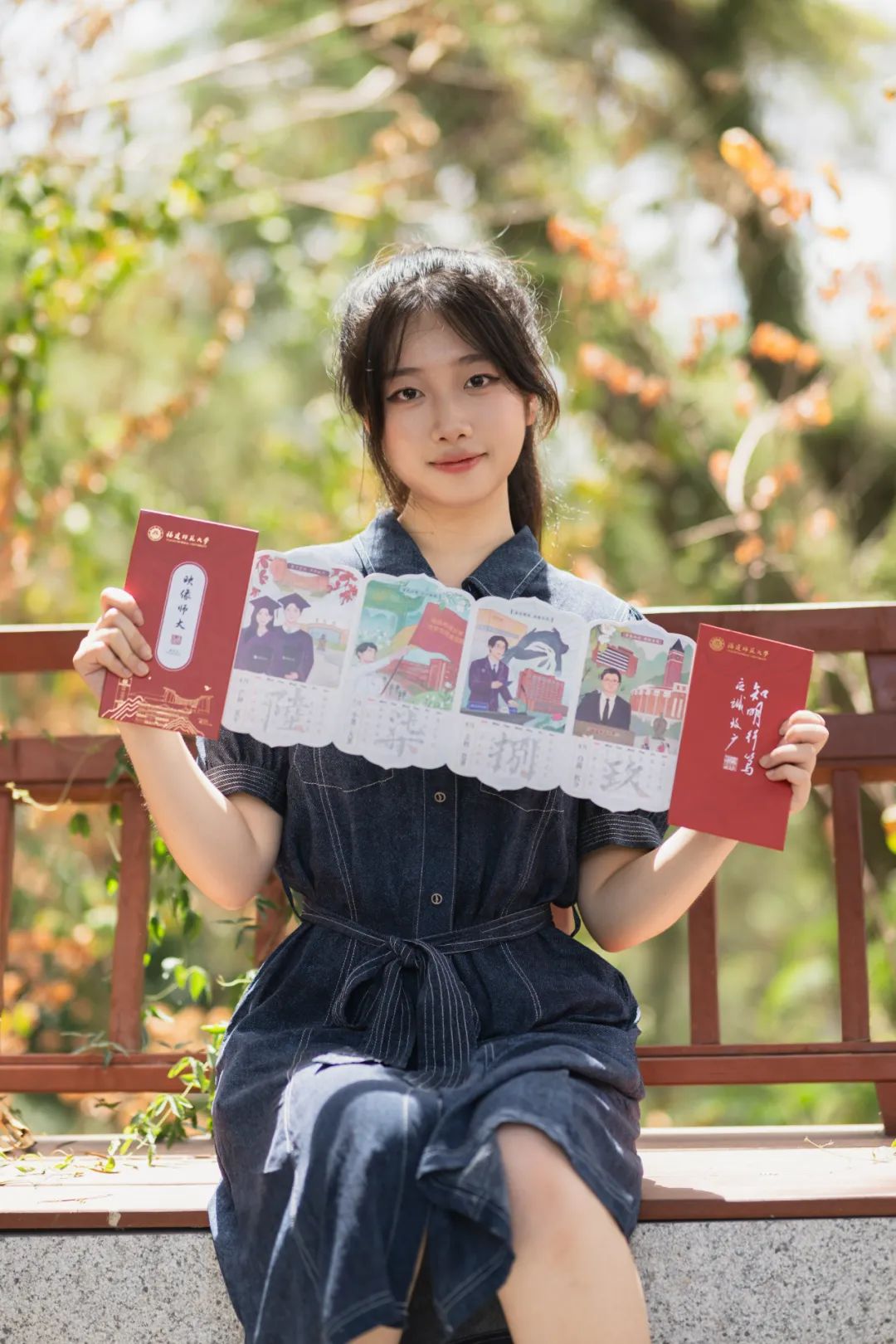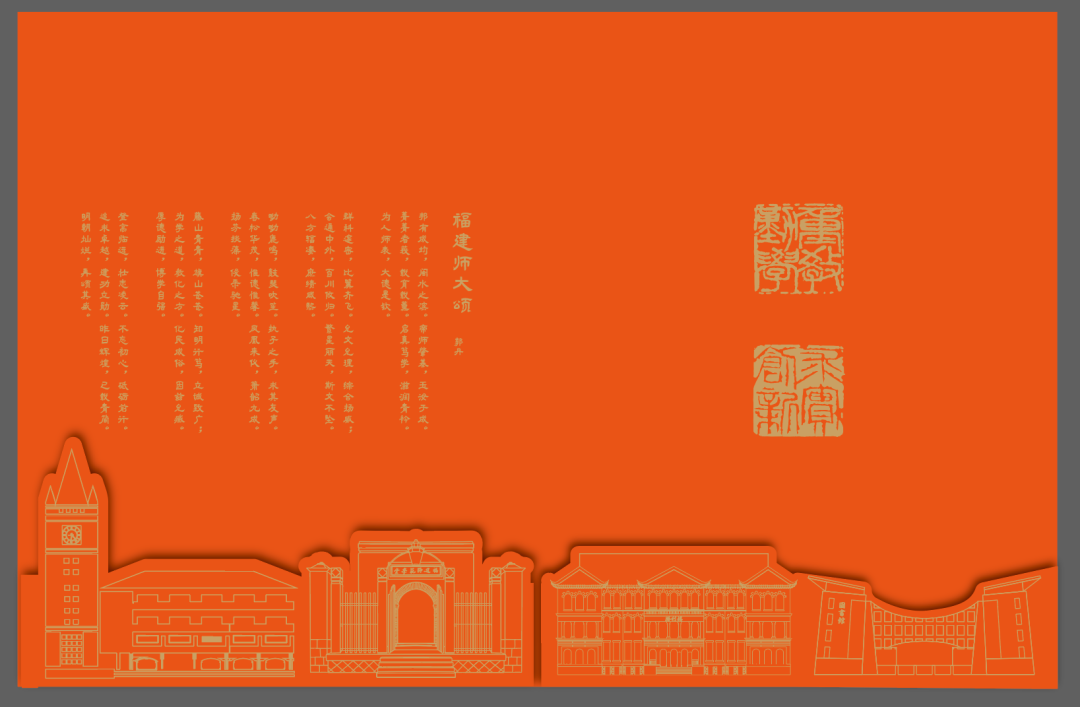 异形外观设计的封套将福建优级师范学堂仓山校区胜利楼旗山校区钟楼、图书馆等建筑元素和校风校训巧妙融合交错排版,融汇古今辅以活力与时尚的“烫金体”和“上岸橙”彰显师大的厚重历史与青春活力极具观赏性!