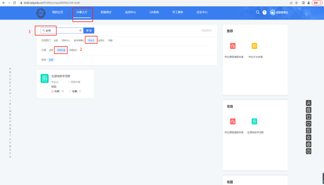 选用360浏览器极速模式或谷歌、火狐浏览器,登陆办事大厅网址:ehall.seig.edu.cn;初始账号/密码:学号/身份证后6位。