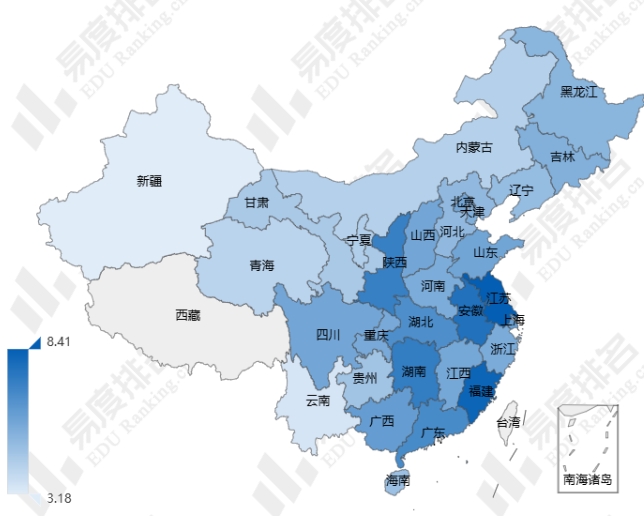 下图展示了全国各省(市,自治区)电子信息类专业招生计划数占比,全国各省(市,自治区)电子信息类专业招生计划数占比最高不超过8.5%,平均约占各省总计划的5.96%。江苏电子信息类的计划占比为全国最高,约为8.41%,其次为福建,约为8.18%。