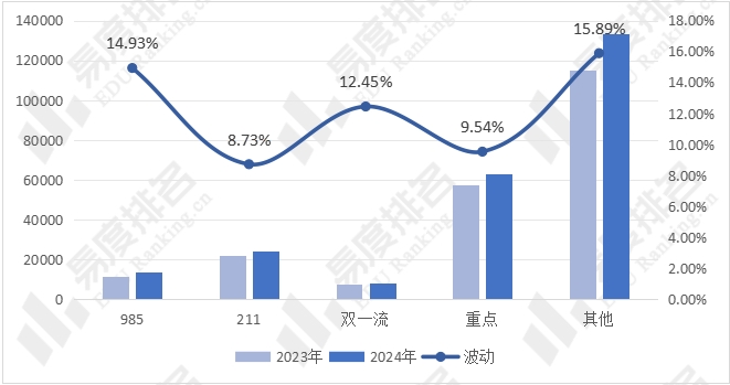 2024年各层次院校均上调了招生计划,其中其他层次院校计划增加幅度最大,为15.89%。双一流及以上院校的招生计划约为4.6万人,占2024年该专业类招生总人数的19%。