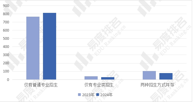 2024年电子信息类专业招生院校共计923所,较去年增加17所。仅有普通专业招生的院校较去年增加47所,仅有专业类招生的院校减少8所,两种招生方式并存的院校减少22所。越来越多的学校倾向于按专业进行招生,将更多的选择权交给了学生。