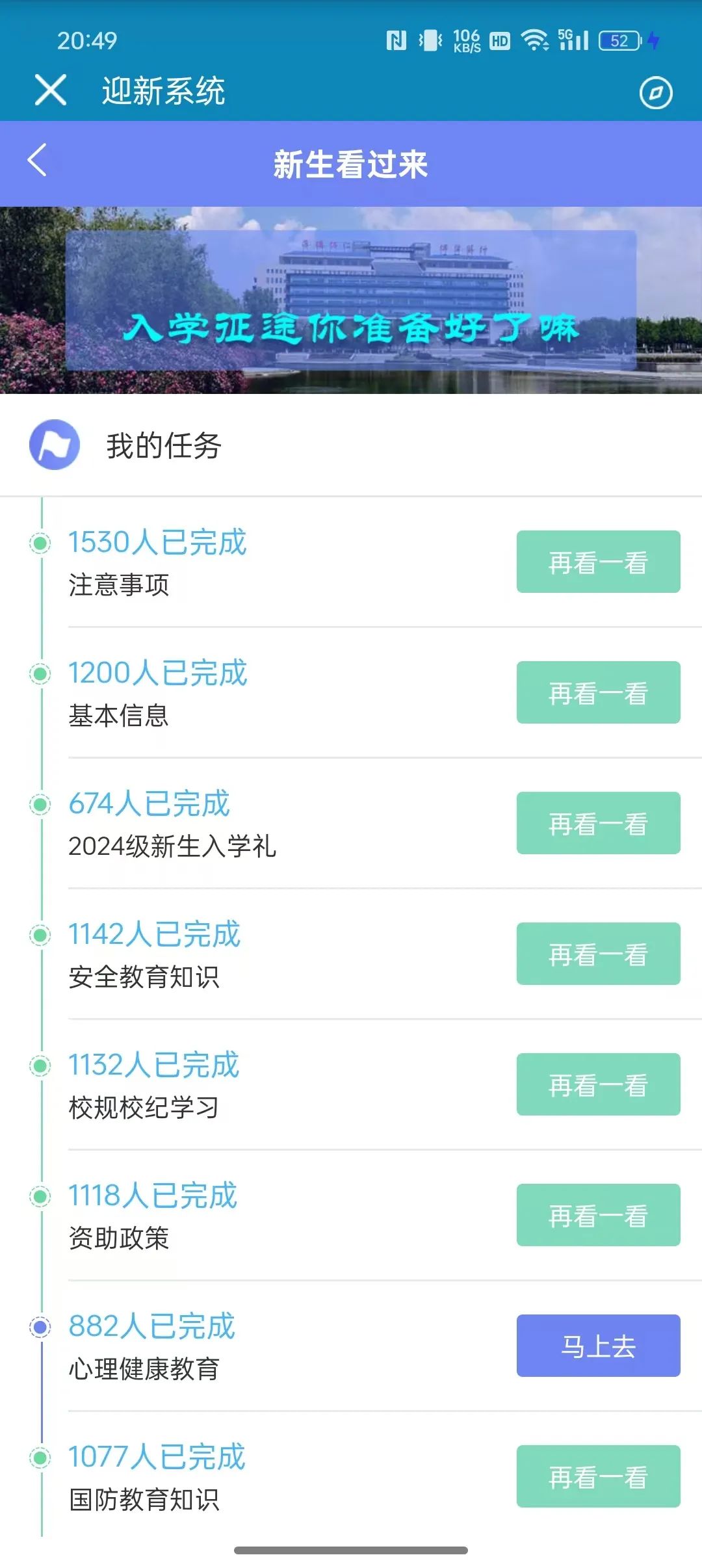 2.新生按顺序完成各环节的扫码,待二维码下面所有环节状态都变成“已完成”,表示现场报到全部完成。如有未完成状态,请到对应环节找迎新工作人员再次扫码。恭喜小萌新们