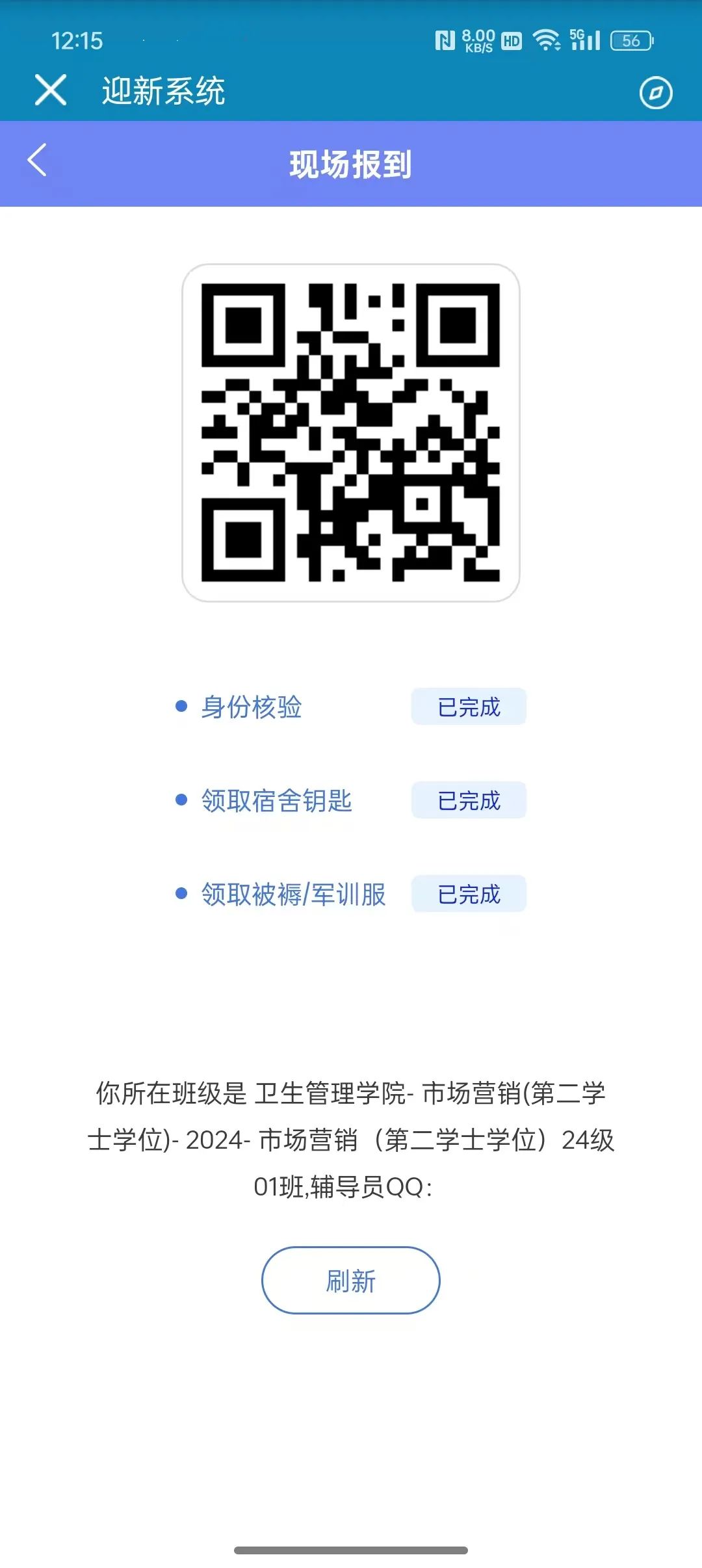 1.经迎新工作人员扫描此二维码后再刷新此页面,二维码下方该步骤对应状态将变为“已完成”,此步骤即完成。