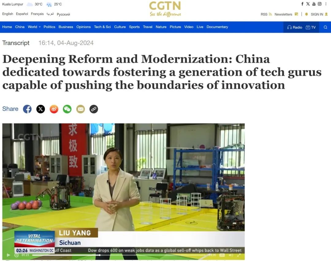 8月4日, 中国国际电视台(CGTN)对我校机器人队作了题为“Deepening Reform and Modernization: China dedicated towards fostering a generation of tech gurus capable of pushing the boundaries of innovation“”(深化改革与现代化:中国致力于培养新一代能够推动前沿创新的科技人才)的专题报道。
