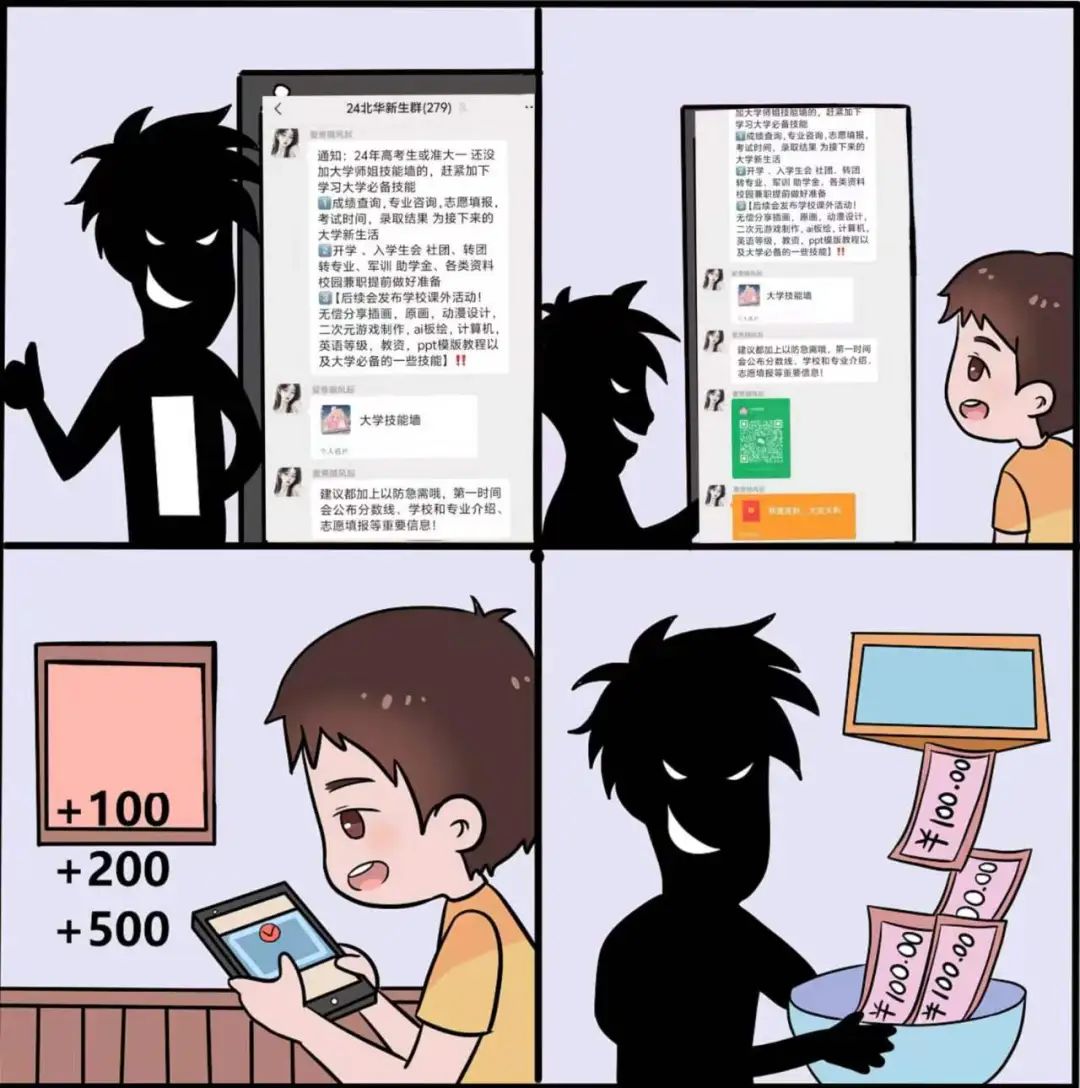 每逢大一新生开学季,各大网络平台如微信、QQ、小红书等,就会出现大量真假难辨的“新生群”“迎新群”“资料群”,他们假装官方,到各个学校学生群中宣传所谓的大学必备技能