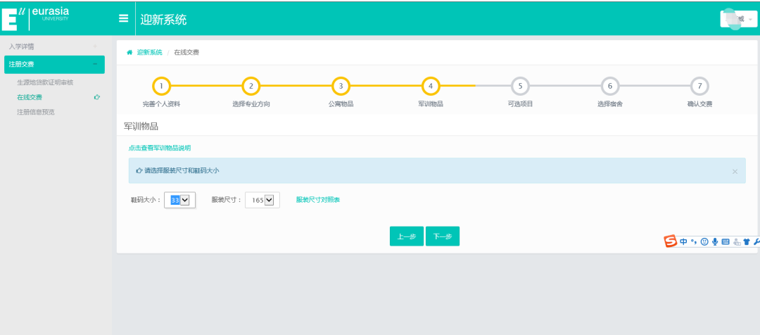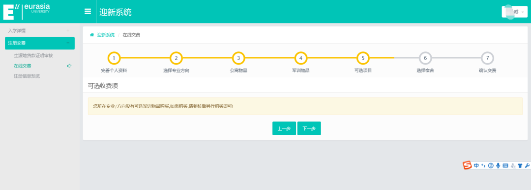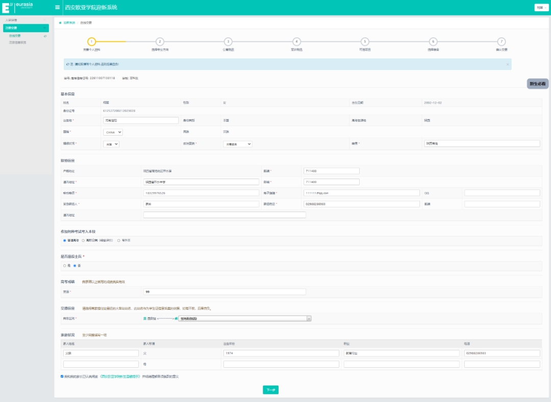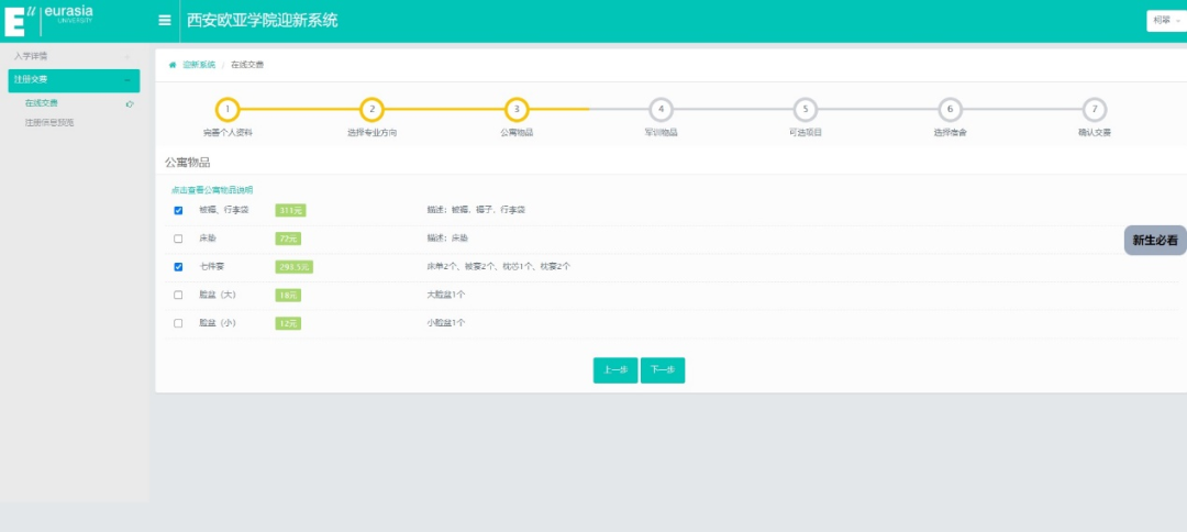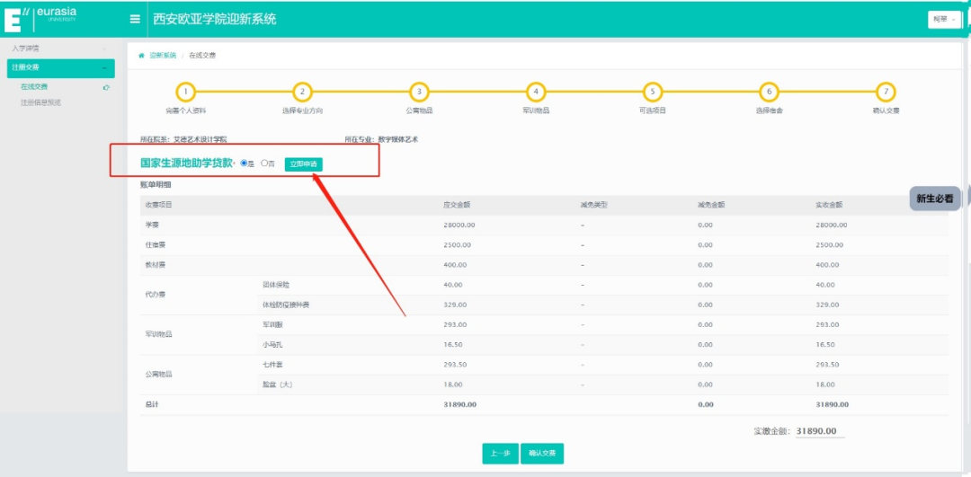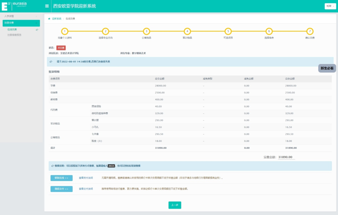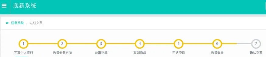 登录进入迎新系统,按照以下7步完成注册缴费