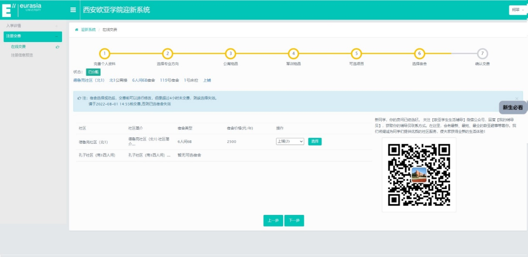 宿舍床铺号选定后,请在4小时内交费,逾期失效。若逾期,需在线重新选择后继续交费,或到校后,在柜台交费之前,重新选择宿舍。如果只能选择默认宿舍,需到校后前往宿管部门由宿舍管理人员安排宿舍。