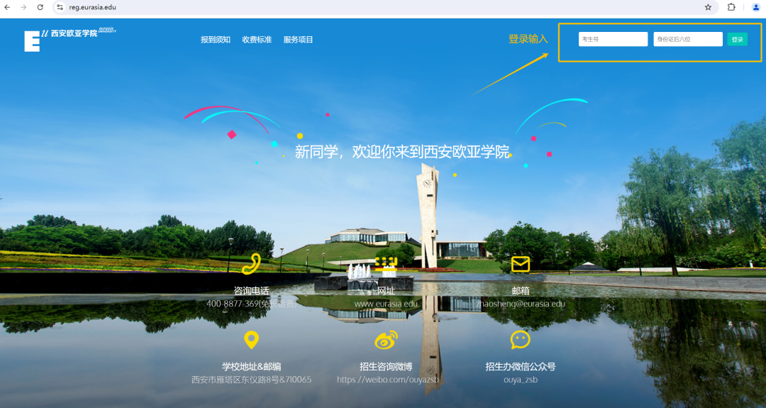 - 通过PC端打开学校官网www.eurasia.edu,点击“2024年新生报到”登录“迎新系统”。
