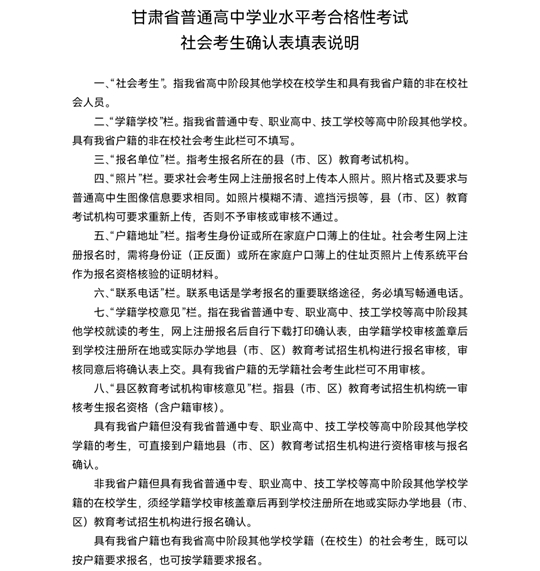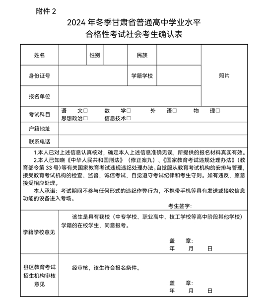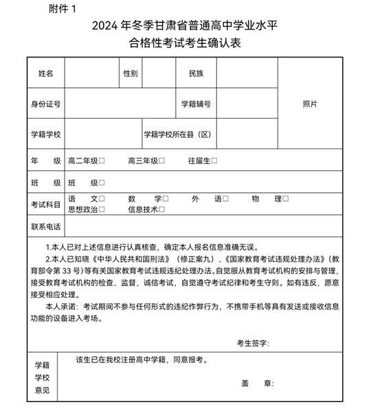 1.报名工作结束后,考生可自行下载打印纸质确认表,经核对无误签字后上交。普通高中生和中职高中生打印《2024年冬季甘肃省普通高中学业水平合格性考试考生确认表》(见附件1),确认表交报名学校。社会考生打印《2024年冬季甘肃省普通高中学业水平合格性考试社会考生确认表》(见附件2),确认表上交县(市、区)教育考试招生机构。如个别考生无法打印纸质确认表,可向报名学校或报名单位申请免费打印。