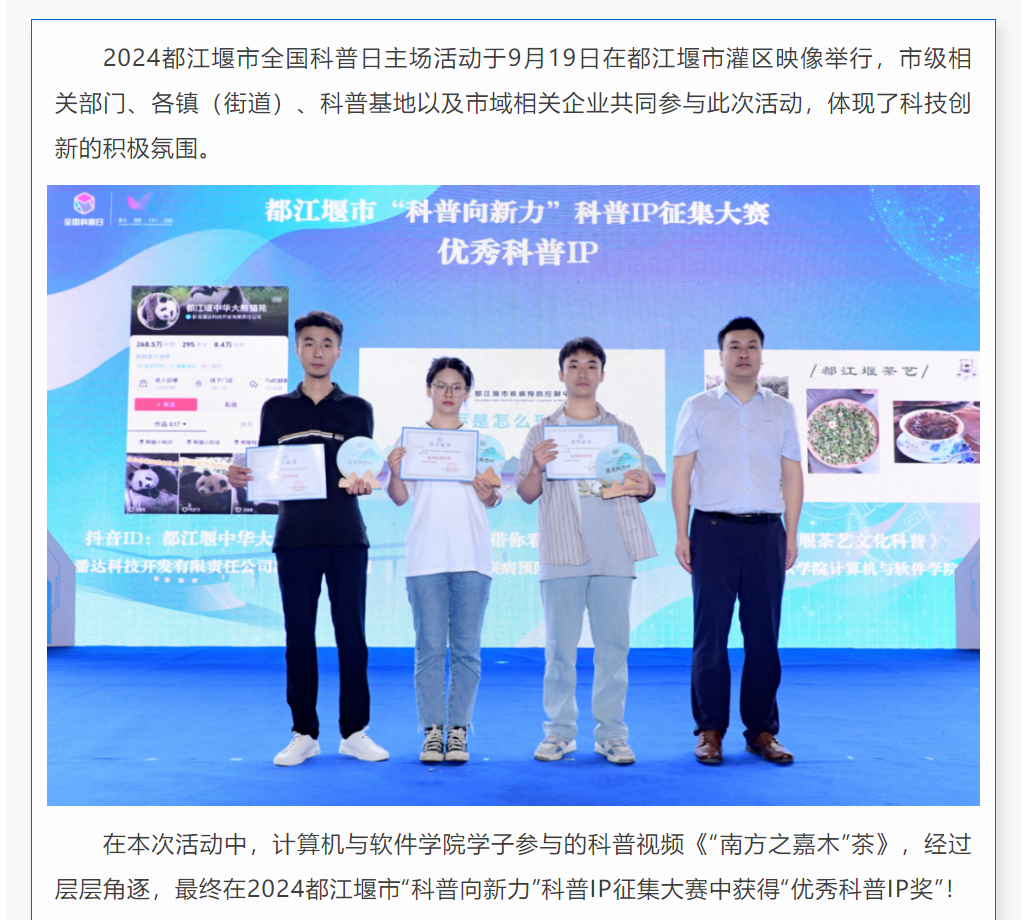 计算机与软件学院学子荣获2024都江堰市“科普向新力”科普IP征集大赛“优秀科普IP奖