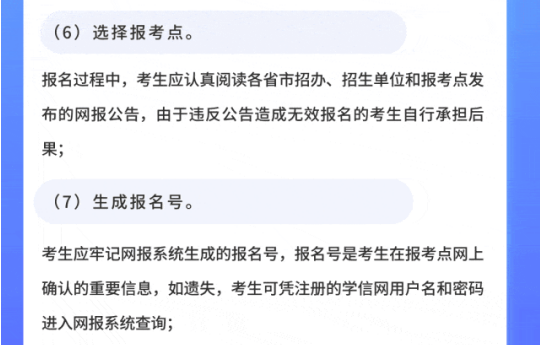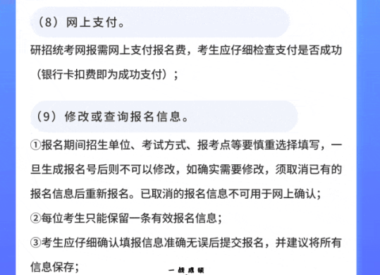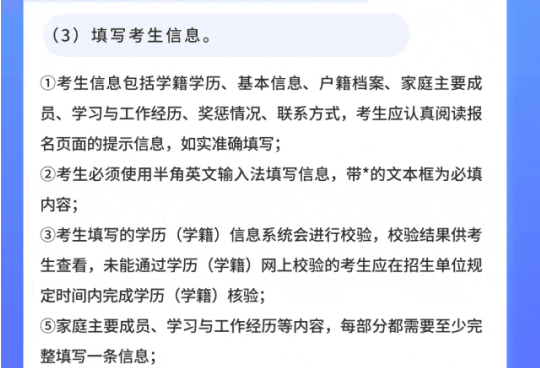 1.填写考生信息功能持续开通到10月28日,没填的考生不需要着急。考生信息在报名结束前都可以修改,请务必多次确认信息是否有误。报名号生成后,招生单位、报考点、考试方式等关键信息不允许修改。每人只能保留一条有效报名