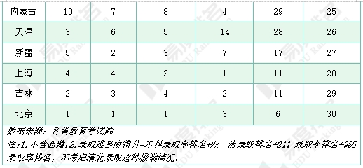 综合录取难度排名前二名均为人口大省,且录取难度得分均要高于110,竞争相当激烈。河南、河北这两个人口大省由于考生数量庞大而优质高校资源稀缺,导致录取竞争极为激烈。