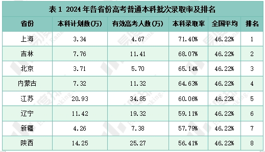 为了更清晰地了解各省高考录取情况差异,本文将通过2024年各省普通本科批次的本科录取率、不同层次院校(清北、985、211、双一流)录取率,以及综合录取难度排名等来反映各省的高考录取难度。