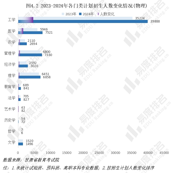 物理科目除文学、哲学外其余门类计划招生人数均增长,其中工学门类计划人数达到39888人,较去年增长13.2%;医学门类专业今年计划人数达到7521人,增幅达到26.5%。