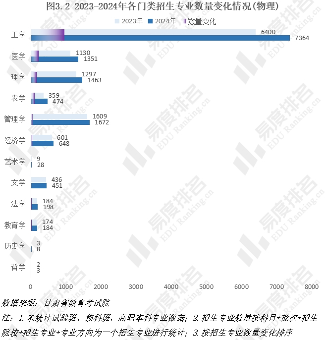 今年物理科目各门类的招生专业数量均增加,理工农医门类专业增加数量包揽前四。其中工学门类专业达到7364个,相比去年增加964个专业,增幅达到15.1%。