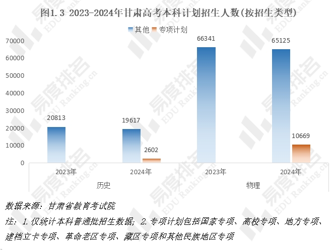 2024年甘肃实施新高考,除有特殊要求的国家专项外其余的专项计划均调整至普通批进行招生,专项计划的大量加入使得普通批的招生规模相比去年大幅增长,普通批计划人数增幅达到12.4%。