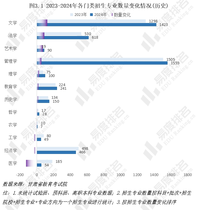 今年在甘肃本科普通批次历史科目招生的专业数量与去年相比,除医学、经济学、工学、农学门类招生专业减少以外,其余门类的招生专业均增加。