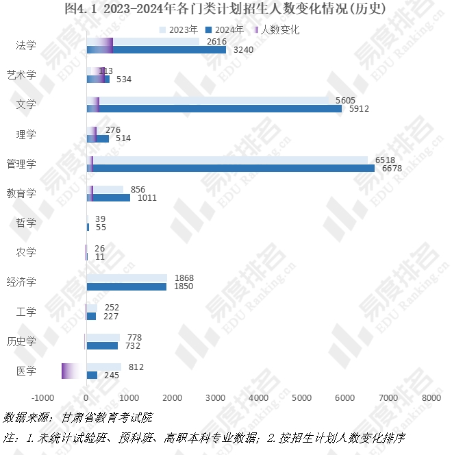 今年历史科目法学门类计划人数相比去年增加624人,增幅达到23.9%。艺术学门类由于艺考改革,多个艺术类专业纳入普通批次招生,因此今年的计划人数相比去年大幅增加。医学门类由于选科要求限制,计划人数相比去年大幅减少,今年仅有245个计划名额。