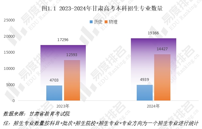 2024年甘肃本科普通批次招生专业达到19366个,相比去年增加11.9%。其中历史科目专业4939个,相比去年增加5%;物理科目专业14427个,相比去年增加14.5%。物理科目专业占比从去年的72.8%提升至74.5%。