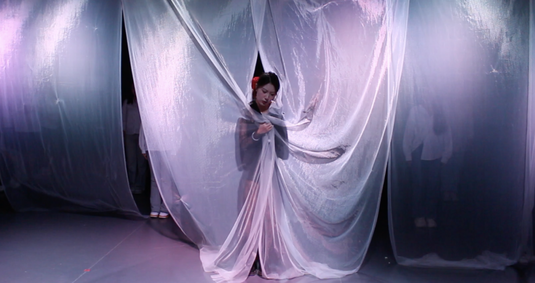 ”精灵”在其中穿梭,长独白展示了人与二者混沌的关系,而纱帐作为两个空间的分界线,引出主角”我”在两地间地徘徊。最终”我”做了个决定,现实世界是资本家的她,决定进入元宇宙的世界,成为一名社畜。一个社畜在逻辑和感知的循环中寻找自己的生存方式的故事开始了。