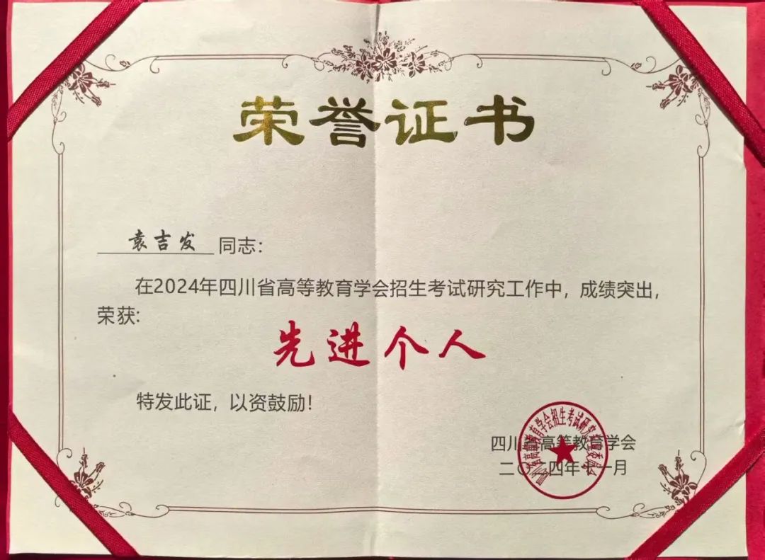 表彰环节中,我校荣获普通高等学校招生考试研究工作“先进集体”荣誉称号、招生就业处副处长袁吉发荣获“先进个人”荣誉称号。