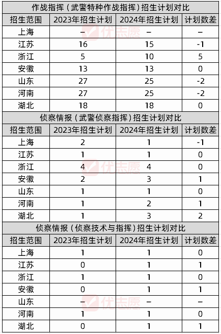 根据上表提供的数据,我们可以清晰地作战指挥(武警特种作战指挥)专业在浙江省的招生计划较于去年有了显著的增长;同时,侦察情报(武警侦察指挥)专业在安徽、河南、湖北三个省份的招生名额也有所增加。由此可见,该校对于培养优秀武警特种作战指挥人才的决心和投入。此外,侦察情报(侦察技术与指挥)专业在2024年进一步拓宽了招生地域,新增了江苏、安徽、湖北三省作为招生范围。这一举措不仅有助于吸引更多来自不同地域的优秀学子,也为该专业注入了新的活力和多元性。