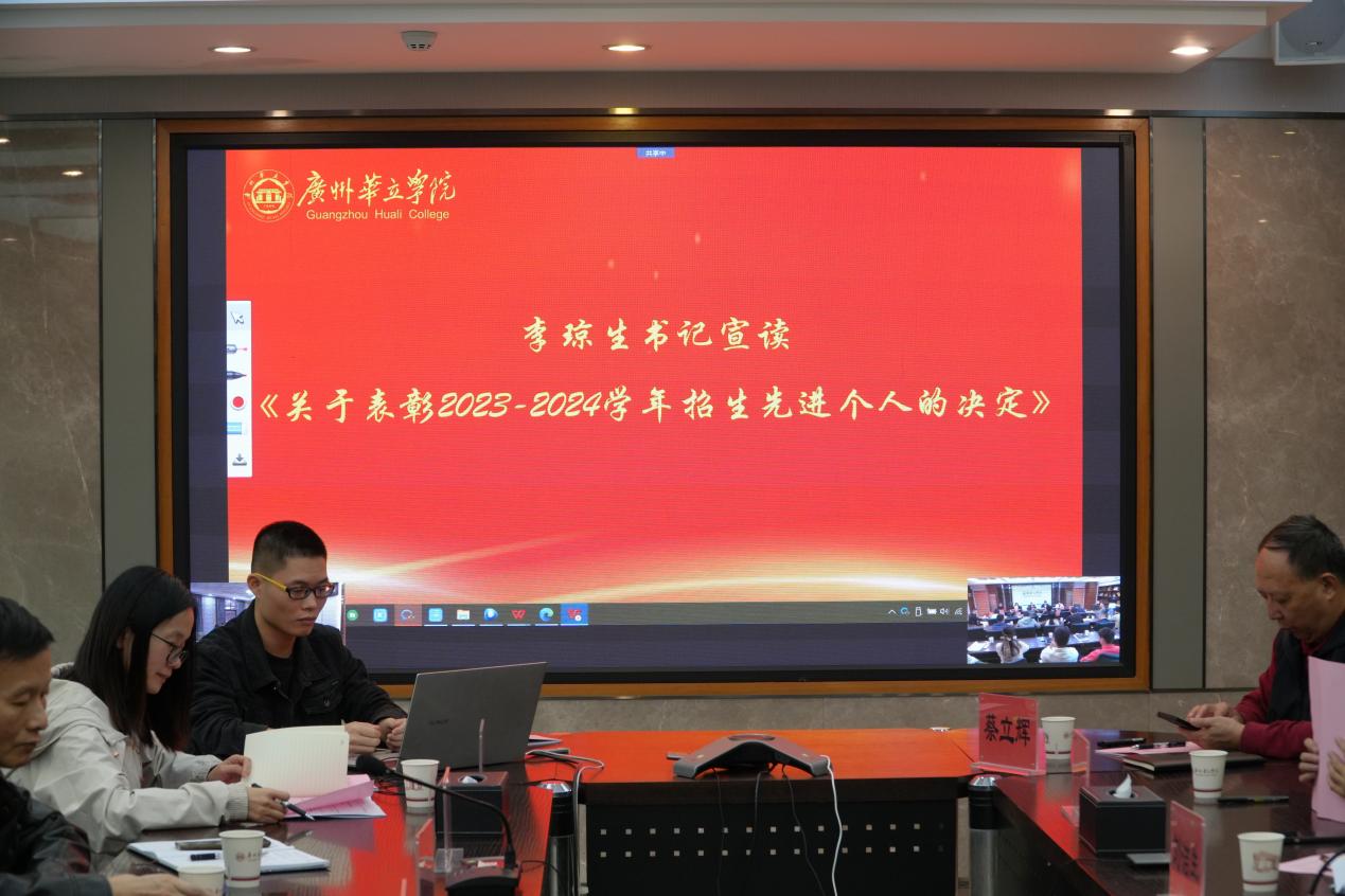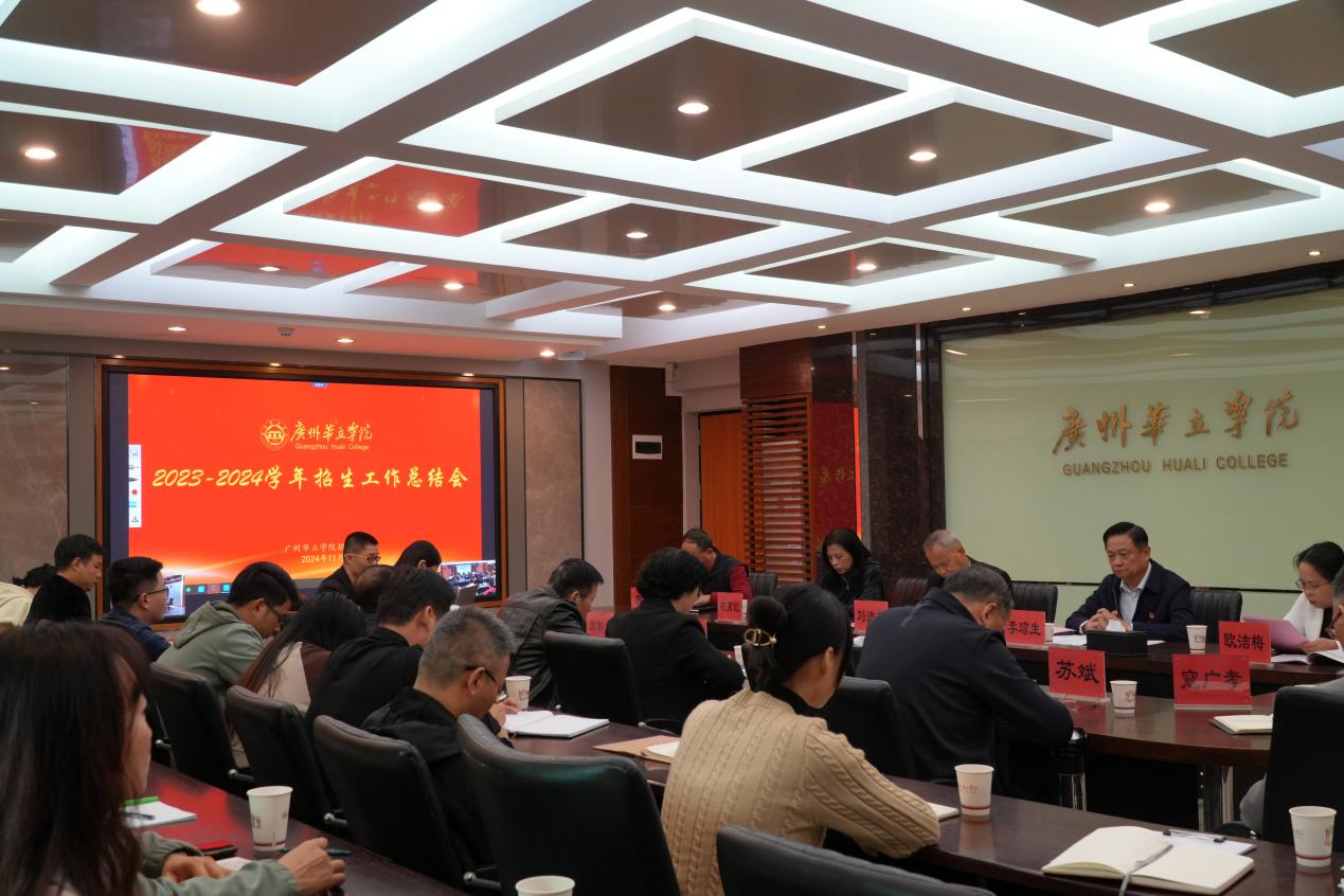 11月21日,广州华立学院 2023-2024学年招生工作总结会在学校会议室召开。广州华立学院校长刘洁生、党委书记李琼生、常务副校长柏育红、党委副书记李玉林、副校长欧洁梅、校长助理蔡立辉、职能部门负责人、二级学院院长、书记及招生骨干教师出席本次大会,大会由副校长欧洁梅主持。江门校区线上参会。