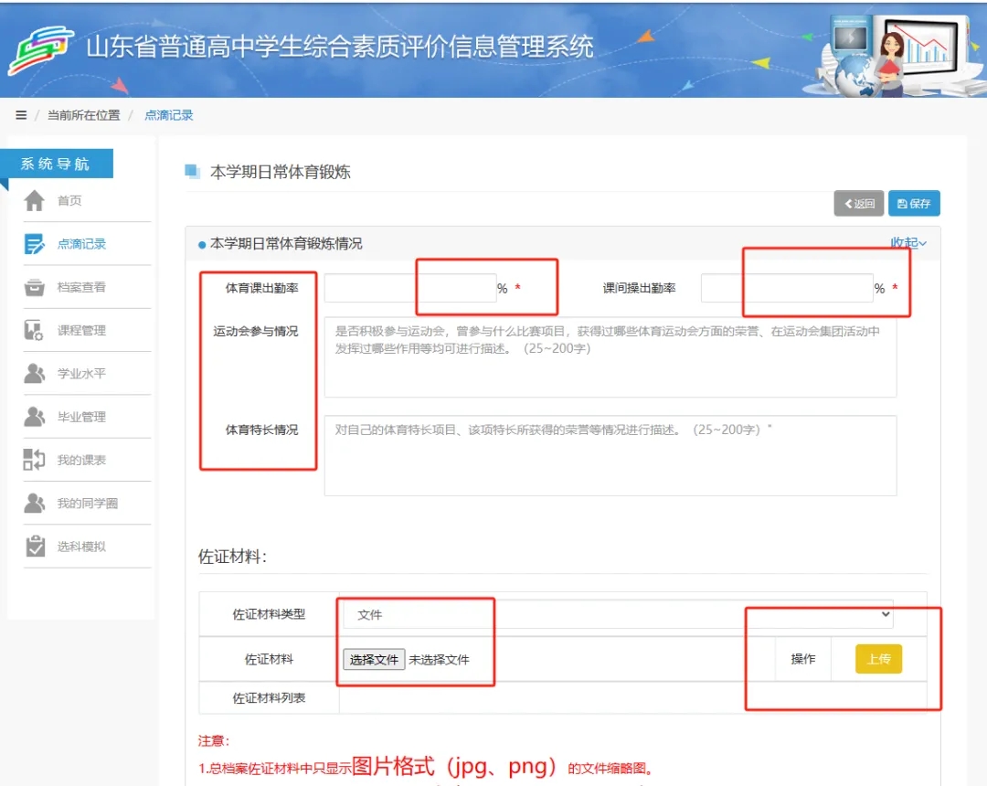 进入“点滴记录”,10项内容中,材料排序高三进行,其他9项都需要学生认真填写。