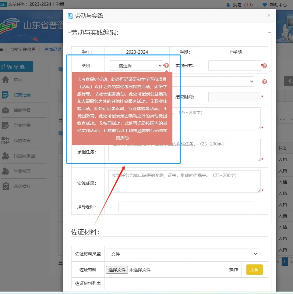 在班级、学生会、团委等任职情况如实填写,在本学期有任职又有荣誉证书可以拍照上传,没有证书的可不上传佐证材料,没有任职的学生选择“无”。