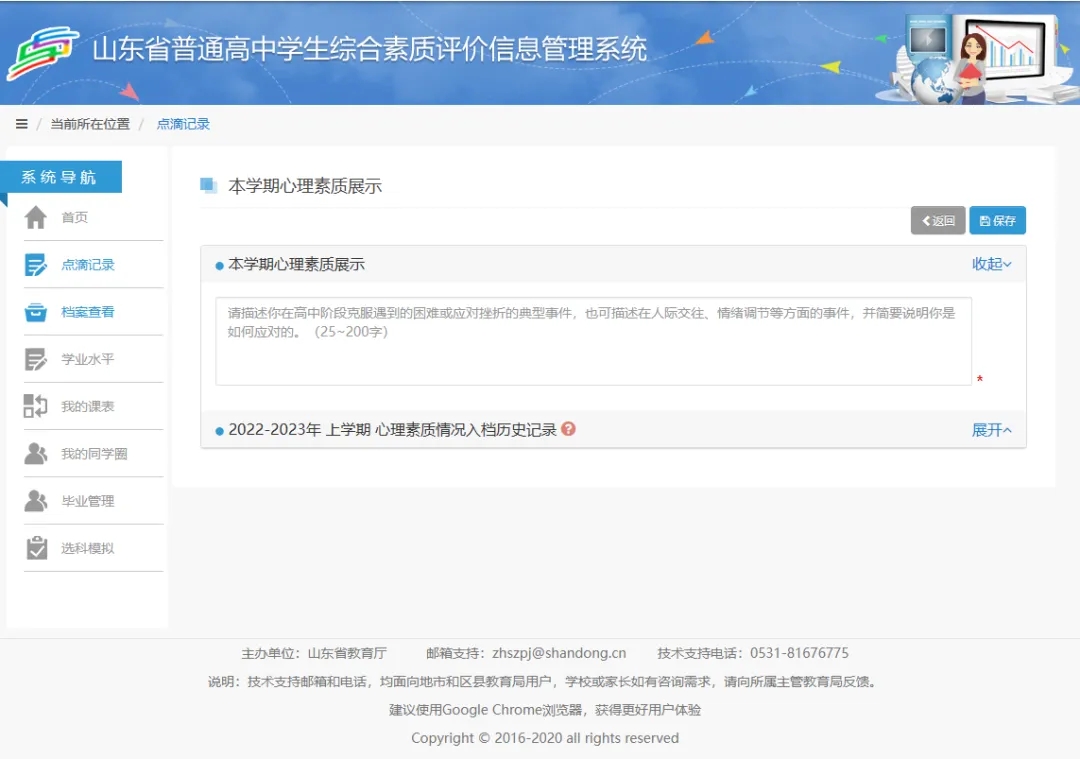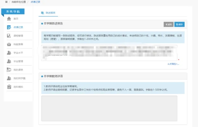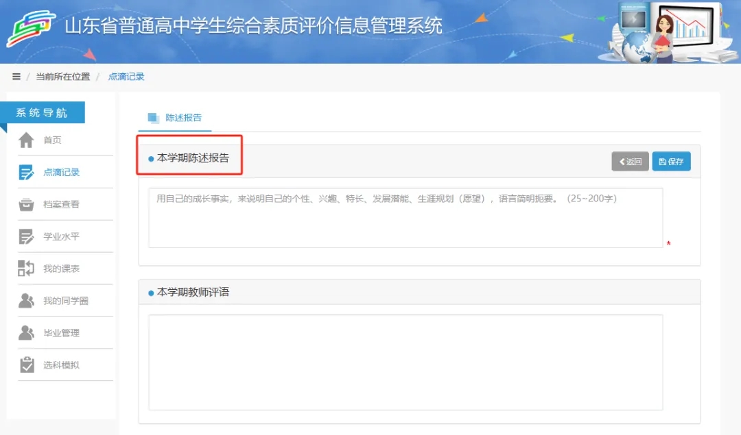 9、陈述报告(必填,25—200字):每学期只能填写一条陈述报告,陈述报告重在用自己的成长事实,来说明自己的个性、兴趣、特长、发展潜能、生涯规划(愿望),或者说是自己对本学期的一个总结,语言简明扼要。